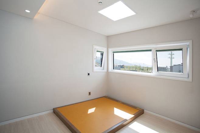 “향후 인접 필지에 주택이 들어서면 1층은 조망뿐만 아니라 일조에도 문제가 생기잖아요. 그래서 가족이 많지 않기에 1층은 다이닝 형태로 공간을 활용하고 2층에서 통상적인 생활을 하기로 계획한 거예요. 2층만큼은 사계절 밝은 햇살을 끌어들이면서 프라이버시도 확보하도록 적당한 높이에 알맞은 크기의 창을 냈어요. 안방에는 떠오르는 해를 보도록 코너 창을 내고, 법정 범위 내에서 최대한 고를 높여 만든 아이 방의 다락에도 1개의 작은 창과 2개의 천창을 냈어요.”
