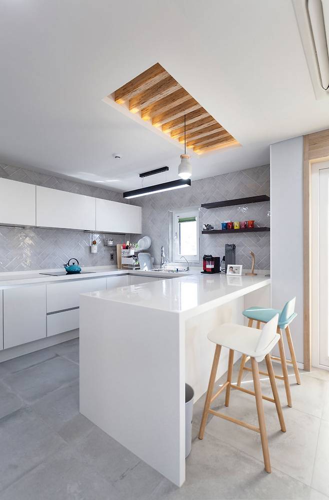 1층은 거실과 주방/식당의 경계에 단을 두어 공간을 구분한 형태이다. 아파트에서만 줄곧 생활해온 부부는 디자인이 만족스럽다고.