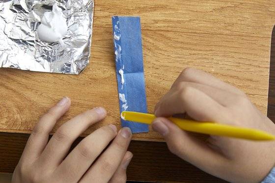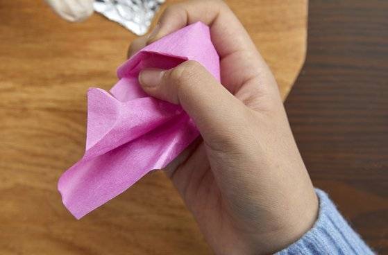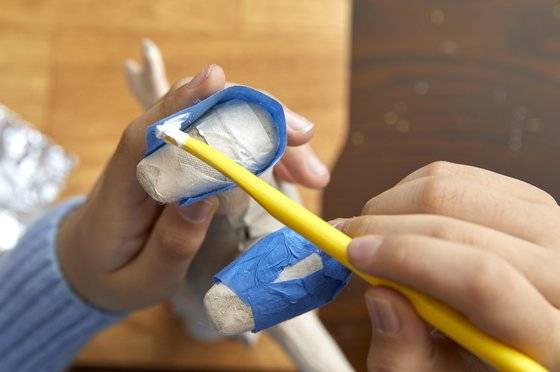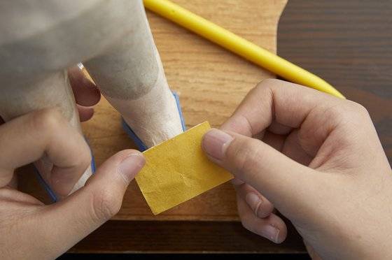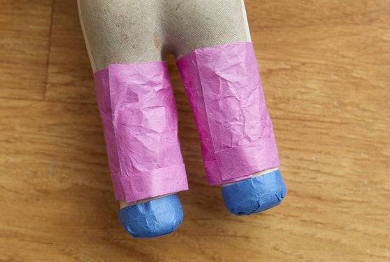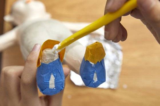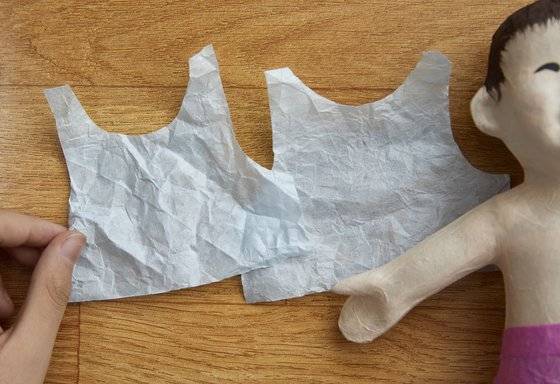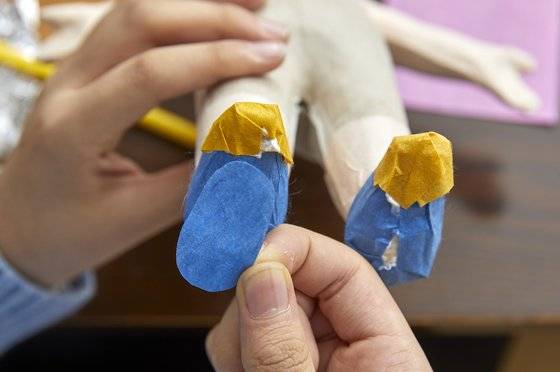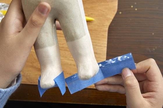 옷의 경우 먼저 손으로 종이에 구김을 줘야 옷이 더 자연스럽게 느껴집니다. 안 구기고 옷을 입히면 진짜 종이를 입혀 놓은 거 같거든요. 준율 학생모델이 남자 인형의 바지를 과감하게 구겼죠. 구긴 종이는 다시 잘 펴줘야 옷이 예쁘게 표현됩니다. “종이를 덜 펴주면 진짜 구겨진 옷을 입은 거 같아요.” 바지 길이를 맞춘 다음 가장자리에 본드를 바르고 접어 붙여 바짓단을 표현하고, 종아리 부분에 붙여줍니다. 허리와 엉덩이 부분을 감쌀 종이를 붙여주고 가랑이 사이로 종이를 넣어줍니다.