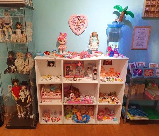 마지막 노란방은 마론 인형, 인형의 집이 가득한 공간인데요. 바비뿐 아니라 ‘세일러문’ ‘웨딩피치’ ‘마법기사 레이어스’ 등 고전 만화영화 주인공 마론 인형들이 모여 있어요. 카라‧방탄소년단 등 K팝 스타의 피규어도 눈에 띄었죠. “세일러문‧웨딩피치 등 고전 애니메이션 마론 인형은 지금은 구하기 힘든 희귀품이라 가장 아끼고 있어요.” 작은 연두색 진열장에는 인형들이 먹는 음식 피규어 ‘식완’도 가득 전시됐죠. 알록달록 인형마을을 산책하듯 여유롭게 둘러보세요.
