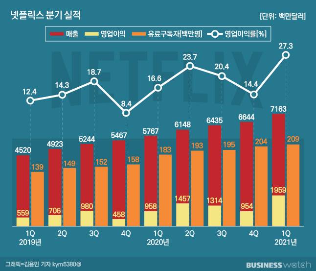 넷플릭스 관계자는 "지난해 코로나19 여파로 매출이 폭발적으로 성장했다면 올 1분기에 들어선 2억명 이상의 유료가입자를 기반으로 수익성이 크게 개선됐다"고 설명했다.