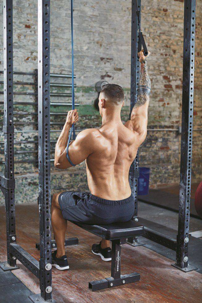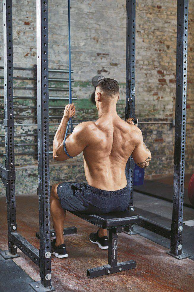 하는 방법: 슈퍼밴드와 D자 모양 손잡이가 달린 밴드를 풀업 바에 감고 그 아래에 벤치를 둔다. 벤치에 앉아 슈퍼밴드를 아래로 잡아당기고 버틴다. 그리고 반대쪽 팔로 다른 밴드를 끌어당긴다. 반복을 모두 완료한 다음 반대쪽 팔로 실시하자.