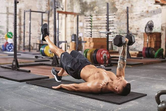 하는 방법: 누운 상태에서 한 손으로 아령을 들어 올리고, 같은 쪽 다리를 90도로 구부린 상태로 발을 바닥에 내려놓는다. 반대쪽 다리는 바닥에서 떼어 위로 올리고, 코어를 곧게 세운 뒤, 가슴 위쪽에서 덤벨 프레스를 실시한다. 모든 동작을 반복한 후 양쪽 팔 다리의 역할을 바꾸어 동작을 완료하자.