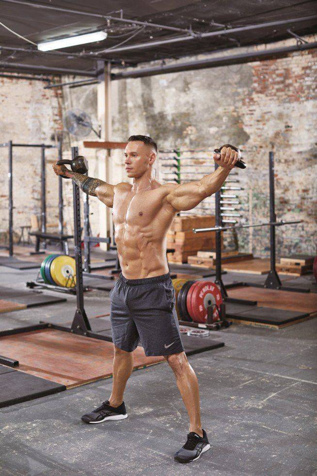 하는 방법: 케틀벨 두 개를 잡아 양쪽 다리 사이에 위치하게 한다. 엉덩이를 앞으로 빼면서 벨을 양쪽 위 방향으로 휘두른다. 양팔을 쭉 편 자세로 벨을 잡고 1~2초간 버틴다.