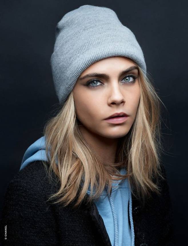 블랙 재킷과 하늘색 후디에 청바지와 스니커즈를 매치한 카라 델레바인은 회색 비니를 쓰고 대중들을 한눈에 매료시켰다.