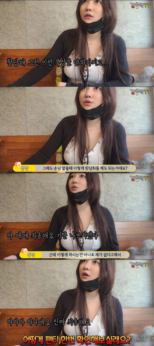 또한 일부 악플러가 BJ 감동란의 의상을 거론하며 또 다른 성희롱을 하자 "내가 무슨 비키니를 입고 갔느냐. 평범한 원피스였다"며 "내가 심한 옷을 입었느냐. 아프리카를 떠나서 평범한 20대 여자가 입을 수 있는 옷이다. 그것도 영상 12도였다"고 억울해했다.