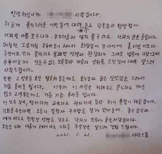 며칠전 그날 아침 유투버님이 오셔서 화장실에 간 사이에 홀 서빙이모와 주방이모간의 불편하고 불쾌한 언행과 뒷담화가 그대로 방송에 나감으로써 유튜버님께 씻을 수없는 모욕감과 마음의 상처를 드린 것에 대해 엎드려 사죄드립니다.