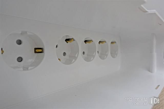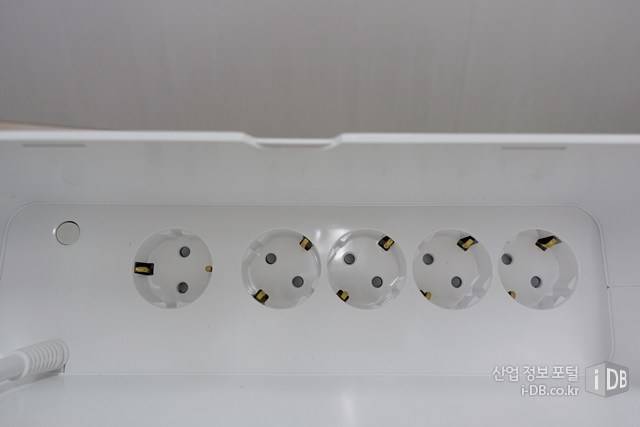 콘센트는 총 다섯 개가 있다. 전원 어댑터의 종류에 맞춰 콘센트의 방향이나 위치를 잡았다. 왼쪽 최상단에 있는 회색 스위치는 과부하 차단 역할을 한다고. 전류 합선이나 허용 전류량을 초과하면 멀티탭의 모든 전류 흐름을 막아준다.