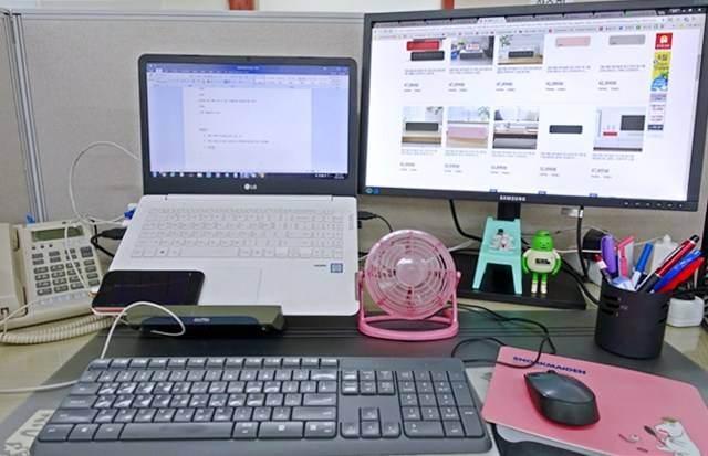 사무실 책상 위 전자 제품을 살펴보니, 노트북(PC 대용), 모니터, 전화기가 있었다. 탁상용 선풍기와 아이폰 충전기도 썼지만, 둘 다 USB 연결 단자로 사용할 수 있어 우선 늘 사용하는 세 개의 전자 제품을 연결해봤다.