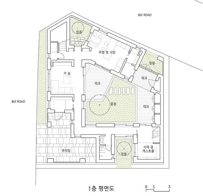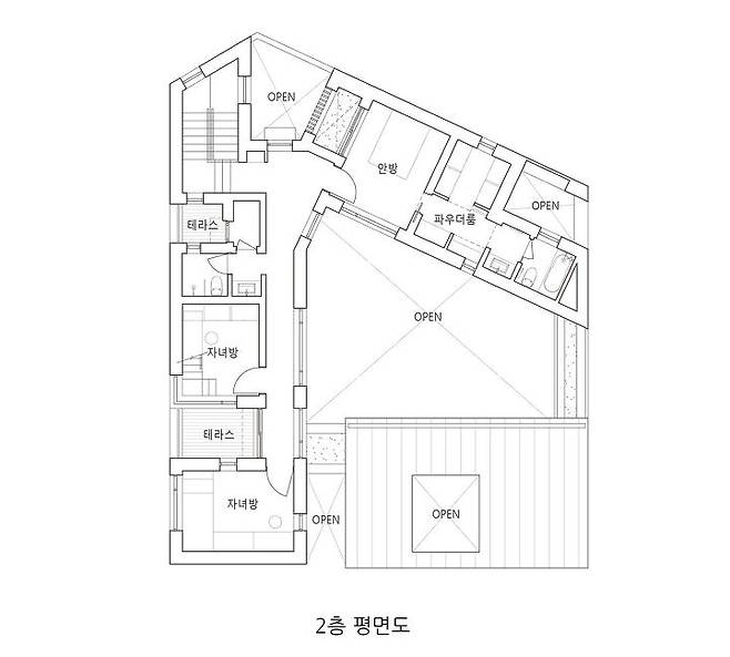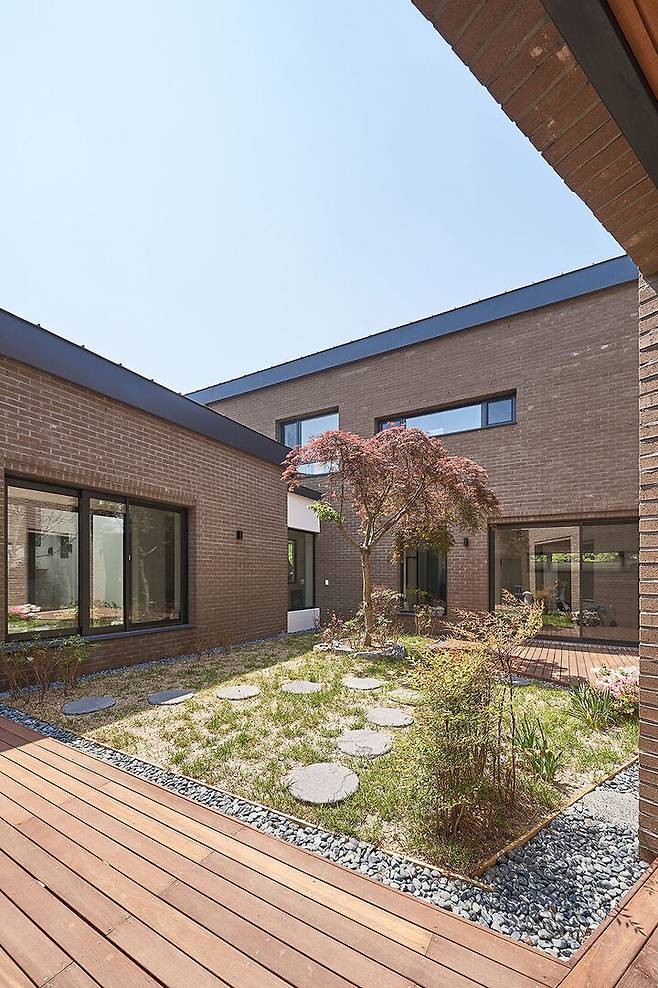 부정형의 필지에 집을 네모반듯하게 앉히고 나면 사용하기 힘든 자투리 땅이 생기게 된다. 이에 건축가는 우선 부정형의 필지를 가득 채우는 볼륨을 만들고 그 중앙을 비워 프로그램을 담을 영역과 마당이 될 영역을 구분했다. 그러고 나서 중앙의 마당과 가족들의 공용공간이 자리할 1층 부분의 채광을 고려하여 남측의 볼륨을 조정했다. 마당을 중심으로 주변을 둘러싸는 구성은 집을 내부로 열리게 하여 건축주가 원하는 거주성을 확보함과 동시에 집의 각 부분이 구심점이 되는 마당을 통해 시각적으로 연계될 수 있는 가능성을 가진다.