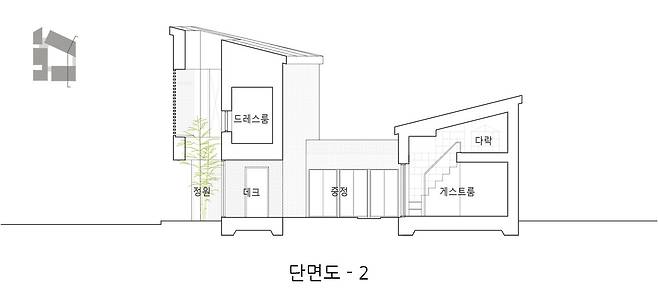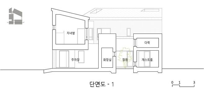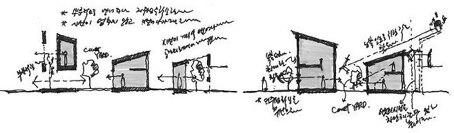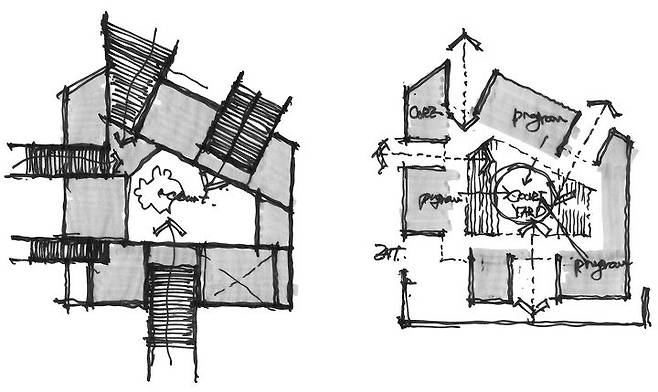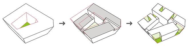 다음 단계로 마당을 둘러싸고 있는 볼륨에서 생활에 사용되는 공간을 배열한 후, 남는 예각의 자투리 땅들을 비워 중앙의 마당 외에 작은 마당을 몇 개 더 만들었다. 이렇게 비워지는 부분들은 집을 구성하는 개개의 프로그램들 사이에 위치하여 외부로 닫혀있는 구성에 균열을 만들어 내며, 이 균열을 통해 가족들의 시선이 외부로 이어지고 이웃들의 시선을 집의 내부로 관통시킨다. 이는 내적으로는 개개인의 가족 구성원을, 외적으로는 집과 이웃을 그리고 자연을 연결하는 역할을 하게 된다.