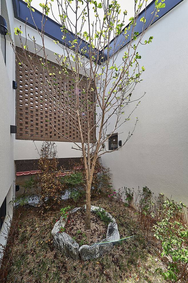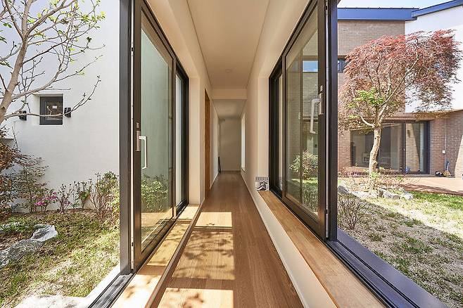 주방 옆 작은 마당과 게스트룸으로 이어지는 복도 옆 작은 마당 등 부정형 대지에서 예각의 자투리 부분을 활용한 작은 마당은 중정과는 또 다른 풍경과 분위기를 만들었다. 또한 여러 곳에 분산되어 배치된 작은 마당들은 시선이 중정에만 머물지 않고 다른 곳으로 이어지게 해 준다.