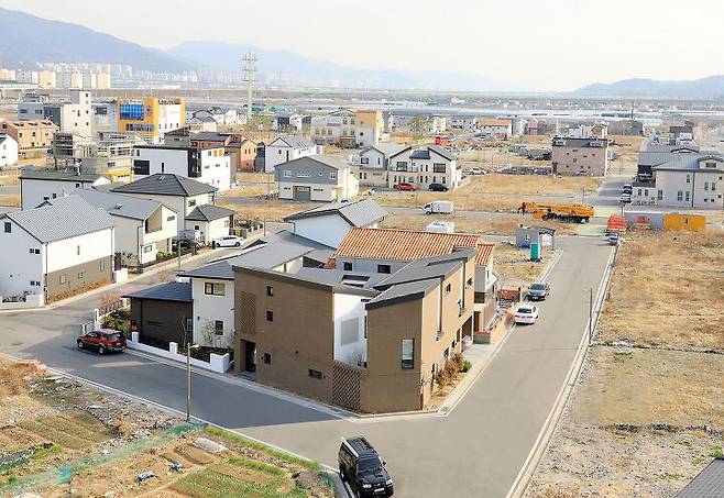 대규모로 조성된 택지에 새로운 집들이 경쟁하듯 우후죽순 들어서고 있는 곳. 마을의 북서쪽 끝자락에 위치한 대지는 두 면이 도로에 접한 부정형의 필지로, 먼저 자리 잡은 이웃집들에 의해 사방이 막혀 있었다. 그나마 서측 도로 너머로 주거지역을 경계 지어주는 증산이 대지의 숨통을 틔워준다.
