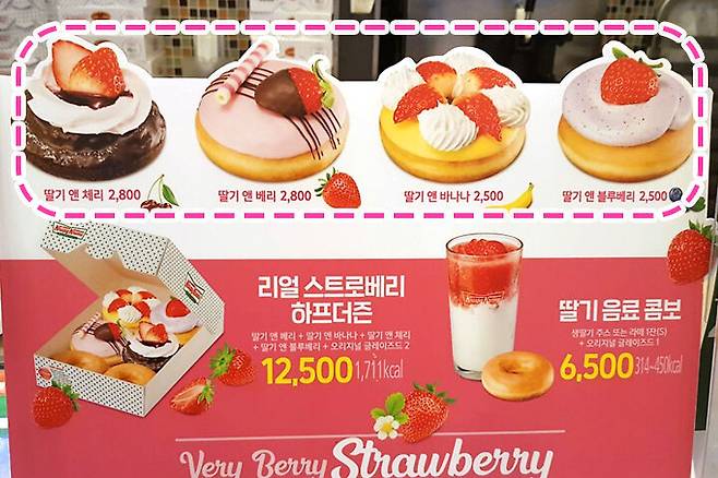 처음에는 신메뉴를 한개씩 사려고 했는데요. 직원분께서 1900원만 더내면 '리얼 스트로베리 하프더즌' 세트를 구매할 수 있다고 알려주셔서 세트로 구매했어요. 신제품인 딸기 앤 베리 + 딸기 앤 바나나 + 딸기 앤 체리 + 딸기 앤 블루베리 + 오리지널 글레이즈드 도넛 2개가 포함되어 있네요.