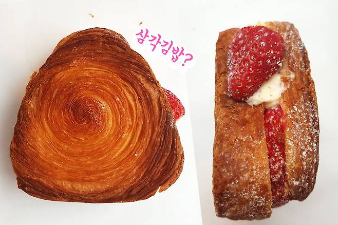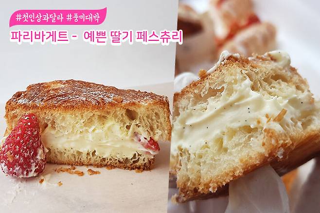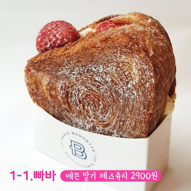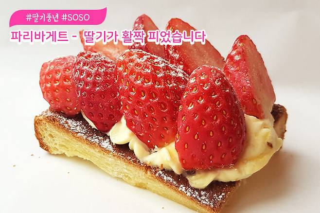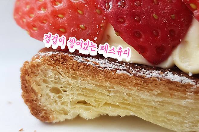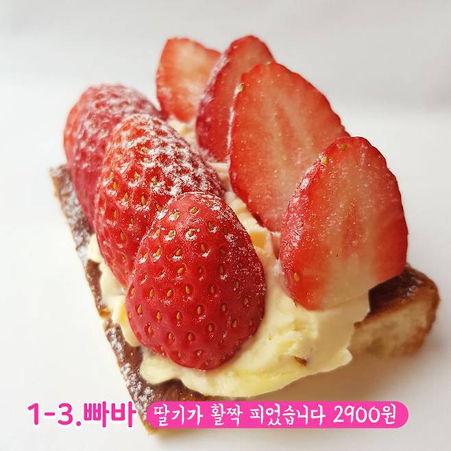 '딸기가 활짝 피었습니다' 라는 이름답게 딸기가 가장 많이 들어있는 빵이에요. 정갈하게 놓여져 있는 딸기가 아주 탐스러워요. 페스츄리의 결이 보이시나요? 예쁜 딸기 페스츄리 제품과 비슷한 듯? 다른 제품같아요.