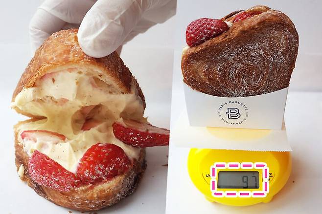 빵을 열어 속을 보니 바닐라빈이 잔뜩 박혀 있는 크림으로 꽉 차있어요. 딸기도 이 정도면 많이 들어있는 것 같아요. 속이 꽉 차있어서 실속 있는 빵 인것 같아요. 맛이 기대되는데요? 무게는 홈페이지에선 100g, 직접 재보니 97g 이었어요.