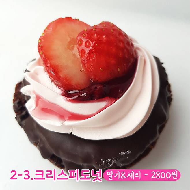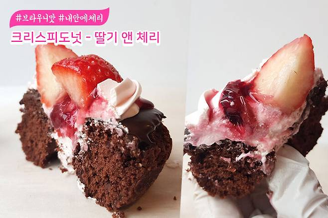 다음은 딸기 앤 체리 도넛이에요. 브라우니 같은 갈색 빵 위에 초콜릿으로 코팅되어 있어요. 당 떨어질 때 최고 일 것 같은데요? 도넛 위의 딸기도 참 실해 보여요. 단면 사진도 함께 보시죠.