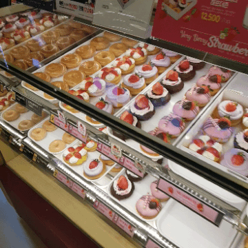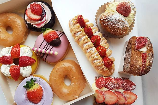 크리스피 매장에 방문했어요. 매장에 들어가자마자 화려한 딸기 비주얼에 압도당했는데요.