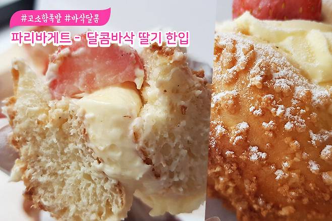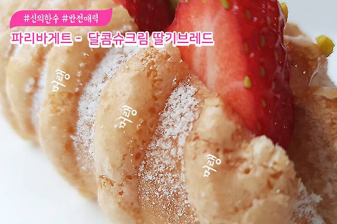 파리바게트의 마지막 빵은 달콤슈크림 딸기브레드에요. 빵 사이에 딸기가 먹음직스럽게 놓여 있네요, 겉 부분엔 머랭 같은 것이 뿌려져 있어서 약간 단단해요.