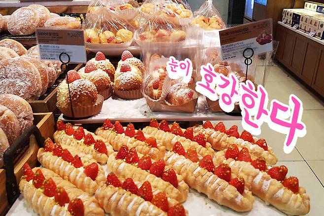 먼저 파리바게트매장을 방문했어요. 눈에 띄는 홍보 문구는 아직 안보였지만 한켠에 딸기 디저트가 모아져 있었어요.