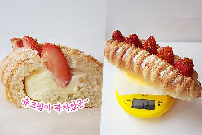 단면을 보니 슈크림으로 가득 차 있는 것을 볼 수 있었어요. 빵이 아주 부드러워 보이진 않았는데 썰어보니 생각보다 부드럽게 잘 썰리더라고요? 무게는 121g이고 홈페이지 상의 무게인 115g 보다 조금 더 나가요.
