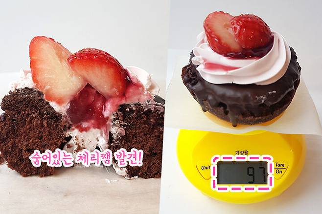 반으로 자른 단면을 보니까 체리 쨈 같은 것이 보였어요. 도넛의 질감이 보이시나요? 자를 때도 이 도넛은 정말 부드럽구나라고 생각했어요. 무게를 재보니 97g 이 나왔어요. 홈페이지에는 116g으로 나와있네요. 흠,, 나만 진심이었어,,?