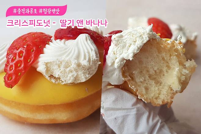 이거 뭐지..? 개꿀잼몰카인가..? 한입 맛본 밥심언니 아주 놀라서 자빠졌어요. 노란색 초콜릿 코팅에서 어린 시절에 사용하던 바나나 향 형광펜의 맛을 느꼈어요.. 빵 부분은 부드럽고 달달해서 부담 없는 맛이지만 바나나맛 초콜릿 코팅이 모든 것을 망쳐놓은 느낌이에요. 상큼한 딸기도 이 맛은 소생할 수 없나 봐요.