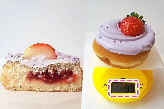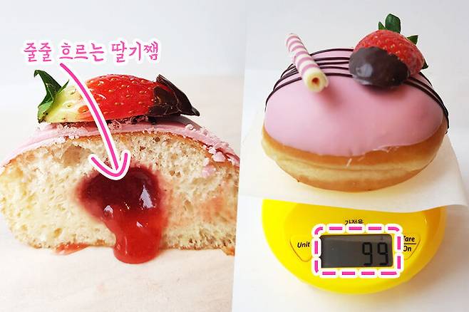 반으로 잘라보니 딸기잼이 줄줄 흐를 정도로 많이 들어있었어요! 다른 도넛을 먹을 때 속에 필링이 부족하면 맛도 심심하고, 약간 손해 보는 느낌이라 기분이 별로였던 적이 있는데 이 도넛은 절대 그럴 일이 없어 보였어요ㅎㅎ 무게를 재어보니 99g 이 나왔어요. 공식 홈페이지에 나온 93g 보다 무게가 더 나가네요?