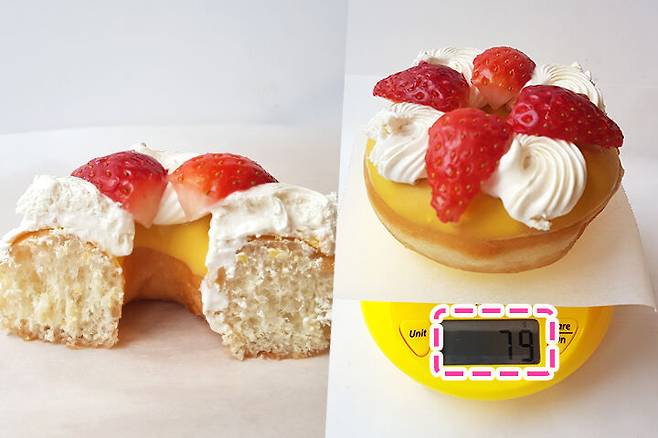 도넛의 단면에서는 눈에 띄는 특징이 안 보여요. 별다른 필링이 없어서 위에 데코 되어있는 초콜릿과 크림, 딸기의 조화가 맛을 좌우할 것 같아요. 도넛의 무게도 한번 재 보았어요. 홈페이지에는 81g로 나와있는데 실제로 재보니 2g 이 모자라네요. 약간 아쉬운 느낌은 지울 수가 없네요 ㅎ