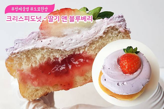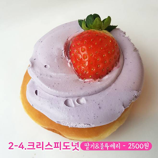 연보라색 크림이 눈에 띄는 제품이에요. 아마도 블루베리 크림이겠죠? 이 크림 색깔이 다한 도넛이에요. 블루베리 크림 선배님 무대를 뒤집어 놓으셨다!
