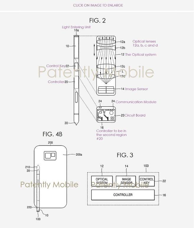 갤럭시 노트 시리즈의 상징인 S펜은 어디까지 진화할까. 갤럭시 노트10의 S펜의 가장 주목되는 변화로 광학 줌 카메라가 기대된다. 지난 2월6일(현지시간) 특허전문 매체 <페이턴틀리 애플>은 삼성전자가 S펜에 광학 줌 카메라를 넣기 위한 특허 출원을 했다고 전했다. 특허에 첨부된 이미지를 보면 렌즈, 이미지 센서, 제어 버튼, 컨트롤러를 내장한 S펜이 표현돼 있다.