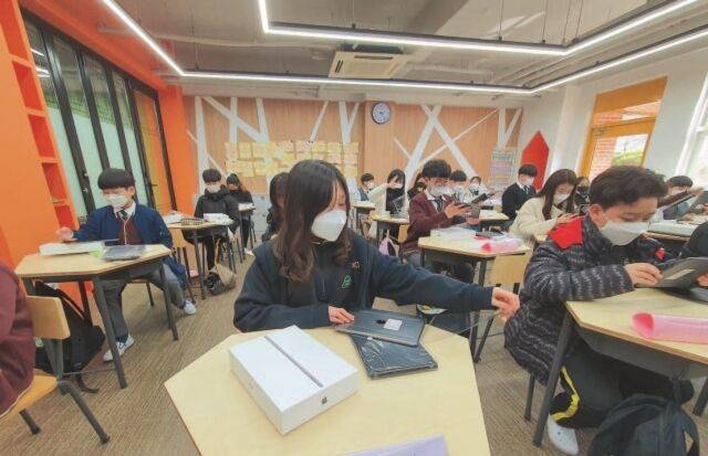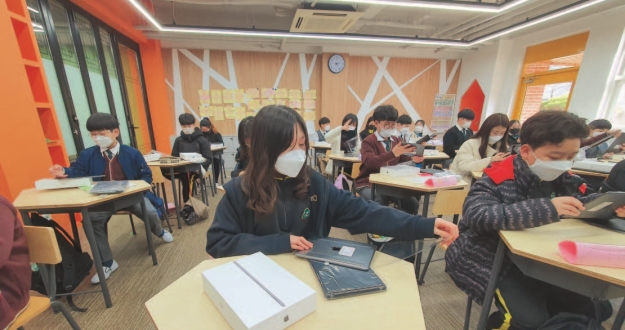 “지난 2교시 수학 시간에는 교과서 없이 태블릿만 이용해 수업을 진행했어요. 각자 태블릿에 쓴 내용이 6개 전체 패널 모니터에 그대로 뜨니 토론 수업을 하기에 좋아요.”