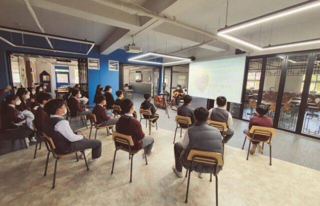 수업참관실에 들어서니 뒤편 벽 쪽에 바이올린·기타 등 아이들의 악기 가방들이 놓여 있었어요. 수업참관실 벽면에서 대형 슬라이드 화면이 내려오면 버스킹 현장이 실시간 중계됩니다. 6학년은 폴딩도어를 닫고 개별 학급 단위로 수업하다가 때로는 폴딩도어를 접어 열고 3개 반이 한데 복도 마당에 모여 공동으로 대집단 수업 활동을 하는데요. 가끔은 저학년 동생들까지 이 복도 마당에 모여 여러 학년이 함께 활동하는 수업이 이뤄지기도 합니다.