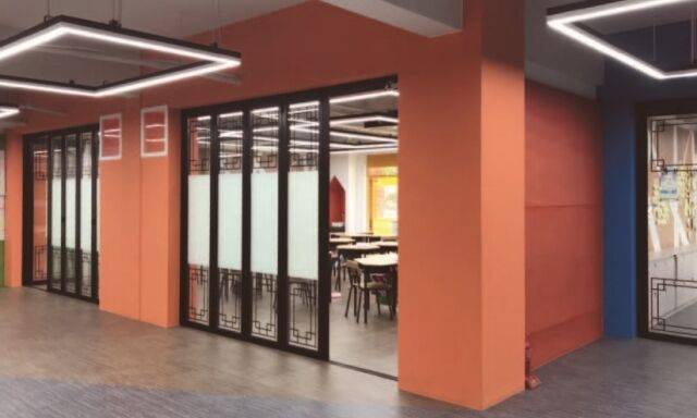 복도를 중심으로 서로 모여 나란히 배치된 6학년 3개 반 교실은 복도 쪽 벽면 전체가 모두 접이문(폴딩도어)으로 돼 있어요. 전통 한옥의 창호 문살 문양을 넣어 멋을 살린 폴딩도어는 펼치면 닫히고 접으면 활짝 열립니다. 그 앞쪽 수업참관실의 폴딩도어 벽까지 일제히 접어서 열면 사방 전체가 확 트여 큰 무대가 생기죠.