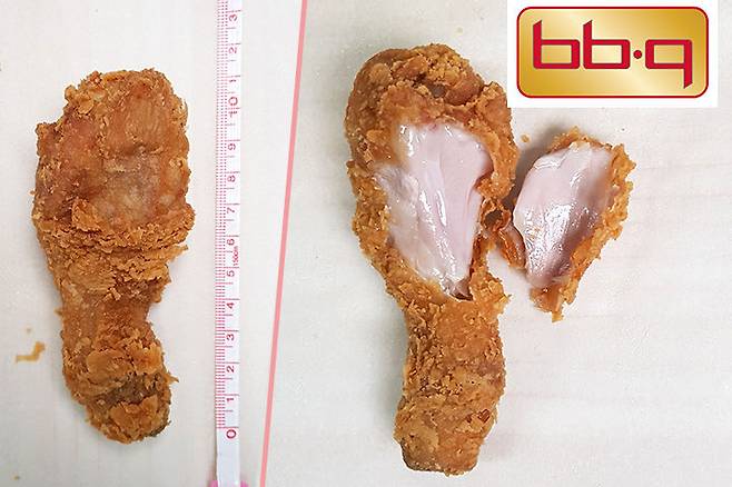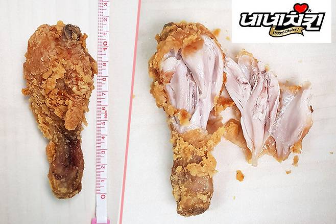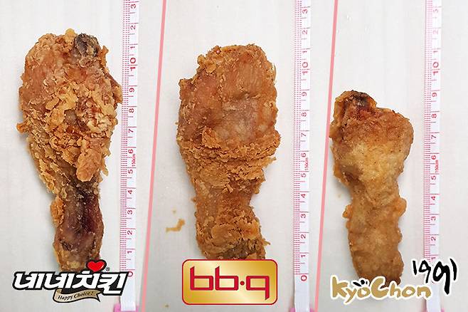 후라이드 치킨 좀 더 상세히 들여다볼까요? 치킨을 시켰을 때 가장 먼저 손이 가는 '닭다리'를 기준으로 크기 비교를 해볼게요.
