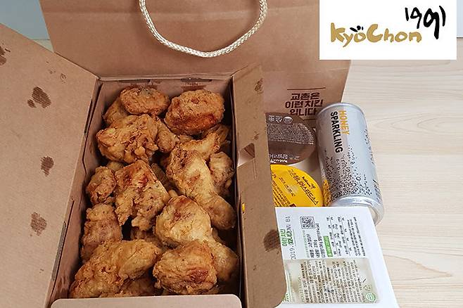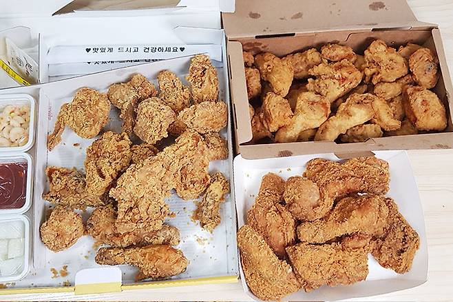 덩치가 다소 왜소해 보이는 교촌치킨은 얼핏 카페 케이크 포장 상자같이 생겼는데요. 열어보니 작은 크기로 잘린 치킨들이 빼곡하게 담겨 있네요. 다른 치킨들과 달리 튀김 옷이 얇다는 게 눈에 띄어요.