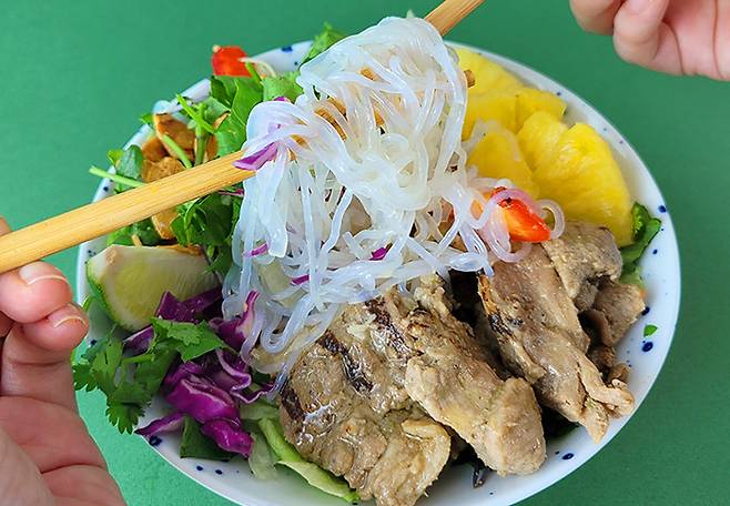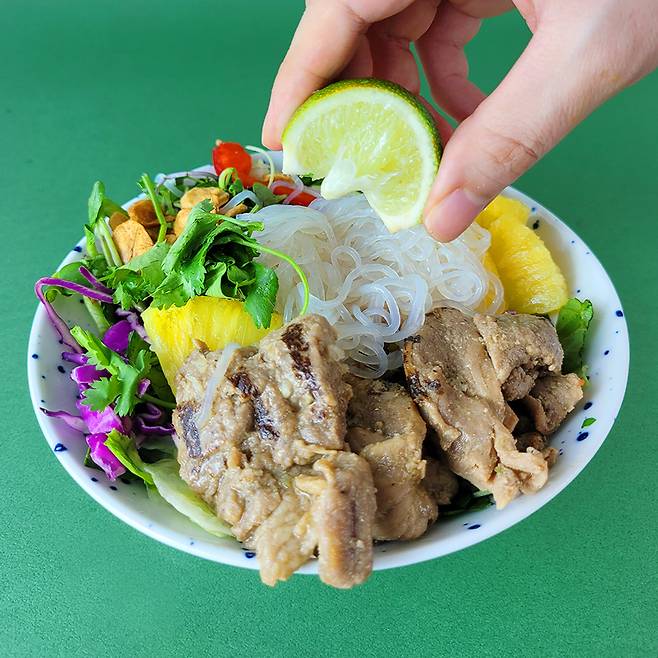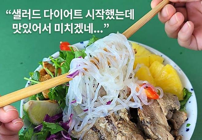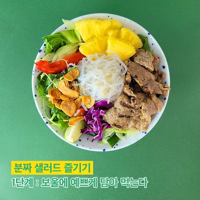 음식을 예쁘게 차려 먹으면 자존감이 높아진다고 하죠? 제대로 하노이 느낌을 내고 싶으신 분들은 집에 있는 보울에 샐러드를 담아서 먹어도 좋아요.