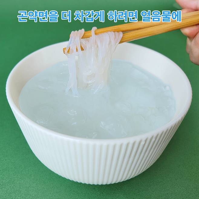 사실 샐러드를 냉장고에 넣었다가 바로 꺼내 먹어도 되는데요. 차가운 느낌을 더 주고 싶은 분들은 이렇게 얼음에 담갔다가 꺼내 먹어도 된답니다. 이날 유독 더워서 에디터는 편의점에서 사 온 얼음컵 위에 물을 붓고 면을 한 번 담가 봤어요.