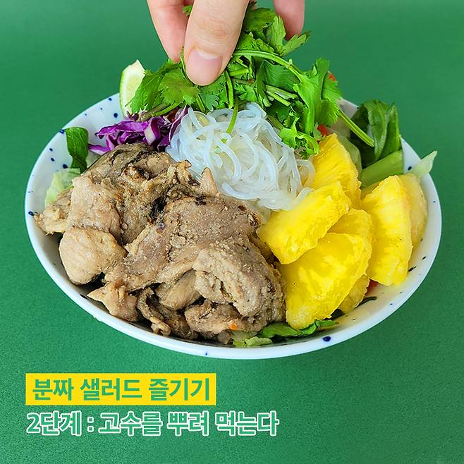 분짜는 한국인 입맛에 특히 맞는 음식입니다. 한국에서 여름에 입맛이 없으면 비빔국수나 냉면을 먹는데요. 베트남 요리인 분짜는 새콤달콤한 소스에 면을 차갑게 해 먹는 점이 우리와 닮았습니다. 특히 강한 향신료는 부담이 될 수도 있는데, 하노이 음식은 깔끔하고 향신료를 많이 사용하지 않아 한국인에게도 부담스럽지 않아요. 분짜가 바로 이 하노이식 음식으로 느억맘 소스에 쌀국수라는 뜻의 '분'과 구운 돼지고기라는 뜻의 '짜'를 야채에 곁들여 먹는다는 뜻이에요. 식당에 가면 나오는 분짜 샐러드는 야채 종류가 한정돼 아쉬웠는데, 프레시코드의 분짜 샐러드는 홍파프리카, 로메인, 양상추, 적채, 베이비채소, 마늘후레이크 등 11가지 샐러드 재료가 들어가 있어 더 상큼하게 즐길 수 있었어요.