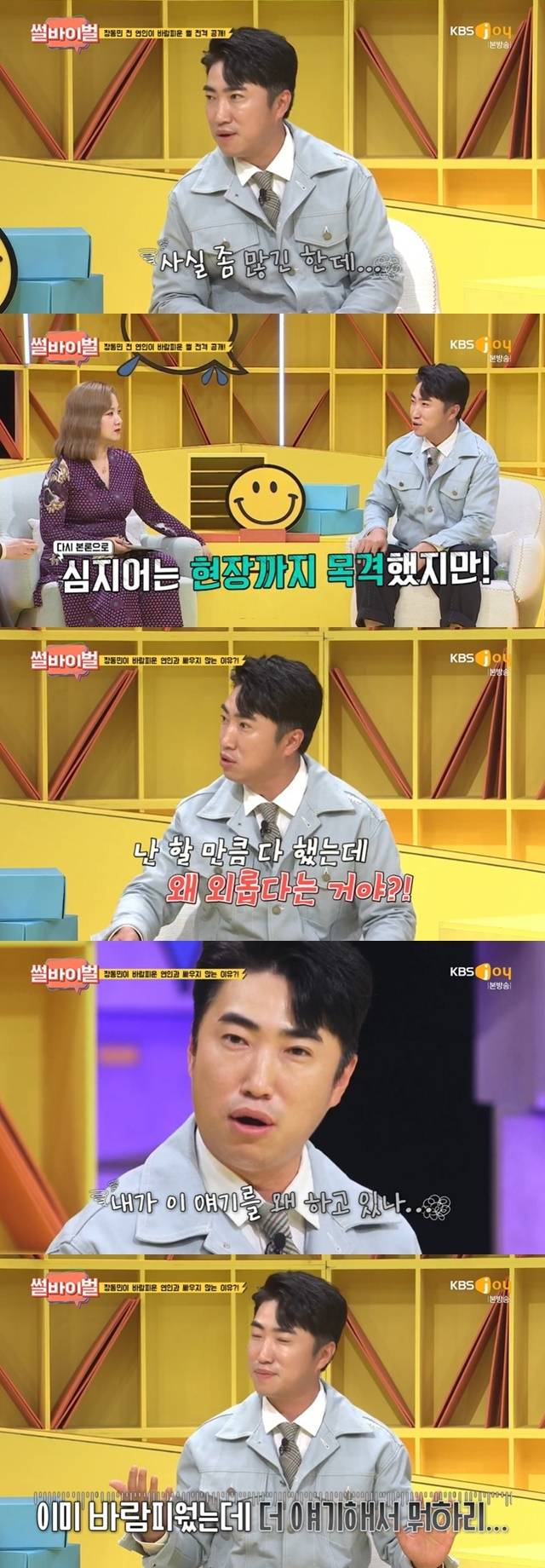 이어 장동민은 “현장도 목격한 적 있지만 단 한 번도 그걸로 싸워본 적은 없다. 처음에는 이야기 해본 적이 있는데. ‘날 외롭게 했잖아’ 그런다. ‘내가 오죽했으면 그랬겠어?’ 여행도 가고 다 했는데 그래도 외롭다고, 난 그걸로 안 된다고 한다. 내가 이 이야기를 왜 하고 있나. 난 어차피 끝이거든. 안 하는 게 낫다”고 설명했다. (사진= KBS Joy ‘썰바이벌’ 캡처)