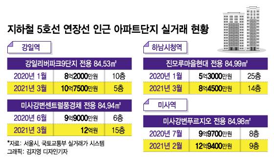 지난해 8월 앞서 개통된 미사역 인근 하남시 망월동 미사강변푸르지오도 전용면적 84.98㎡이 지난해 7월(8층) 9억9700만원에 거래됐는데, 지난달에는 9층이 12억9400만원에 팔렸다.
