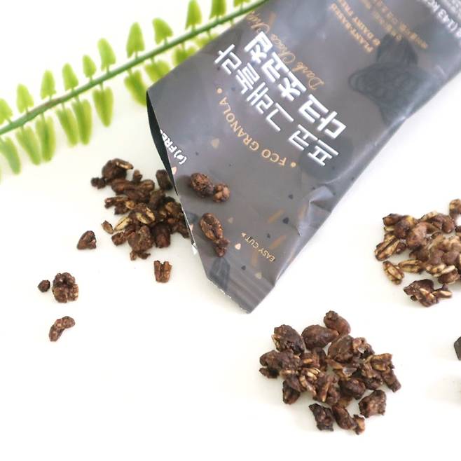 프레시코드 다크초코칩 그래놀라는 불포화 지방산이 가득한 해바라기 씨, 동물성 성분이 없는 비건 다크초코칩, 카카오 분말이 들어있었어요. 원래 그래놀라는 뭉쳐있어서 어떤 곡물이 들어갔는지 확인하기 어려웠는데, 이렇게 하나 씩 나눠져 있어 구성 요소가 잘 보였어요.
