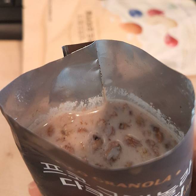 이렇게 오트밀크에 넣어서 바삭함을 즐기다가, 죽처럼 후루룩 넘겨서 먹는 것도 좋아해서 불려 봤어요. 5분이면 금방 불더라고요? 한 손에 쏙 들어가는 크기라 손으로 들고 먹을 수 있었어요. 학교 다닐 때 라면 봉지에 뜨거운 물 붓고 친구들이랑 호로록 마시던 때가 생각나네요ㅎㅎ
