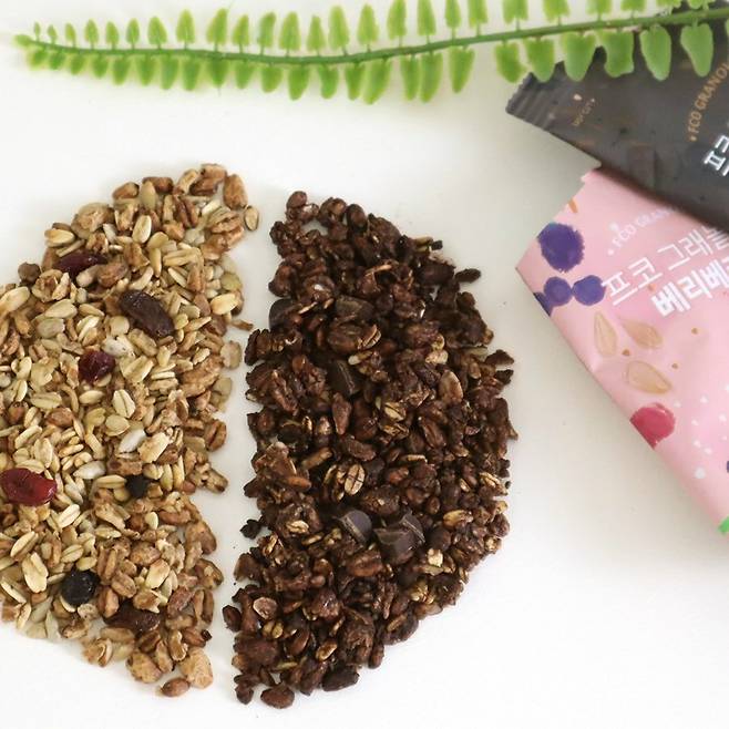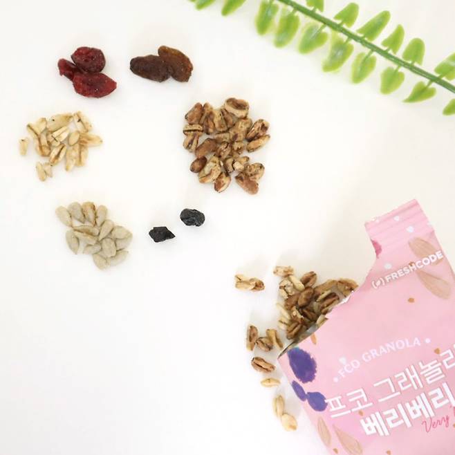 그래놀라는 종류가 다양한데요. 달달한 베리 그래놀라와 쌉싸름한 다크 초코칩 그래놀라 두가지를 먹으면 질리지 않고 먹을 수 있죠. 두 제품을 보니 구성이 조금씩 달랐는데요. 귀리는 동일한데, 프레시코드 베리 그래놀라는 청포도를 건조한 쫀득한 설타나, 항산화 성분 가득한 크렌베리, 눈의 피로를 완화 시켜주는 블루베리, 비타민C가 풍부한 동결걸조 레드커런트가 들어 있었고요.