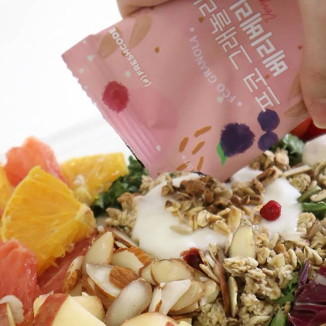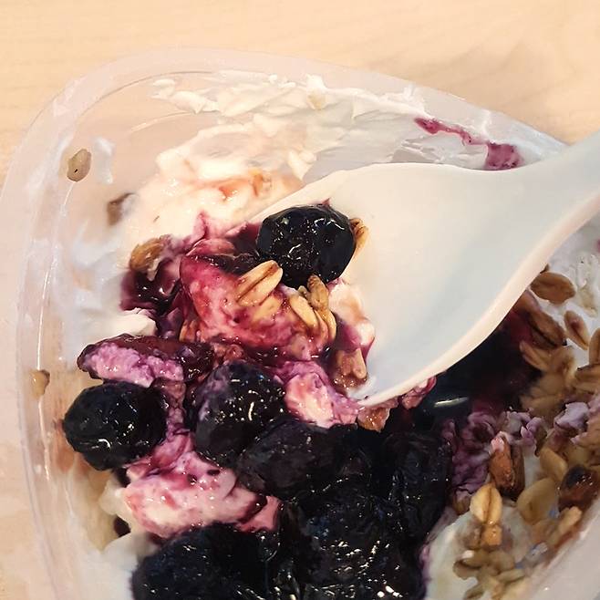 아침에 요거트 많이들 드시죠? 그런데 요거트만 먹고나면 뭔가 배가 허전한데요. 이럴 때도 그래놀라를 곁들이는 게 좋아요. 특히나 제가 '비벼먹기'라고 했는데, 이유를 아시나요? 시중에서 파는 그릭 요거트는 묽은 질감이 많은데요. 여기에 그래놀라를 말아 먹으면 어느 정도 그래놀라가 불어야 부드럽게 먹을 수 있잖아요. 프레시코드의 요거트는 크림치즈처럼 꾸덕하면서도 입에서 사르르 녹는 가벼움이 있더라고요. 이렇게 비벼 먹으니 그래놀라가 요거트 안으로 쏙 숨어서 단단한 질감이 느껴지지 않았어요.