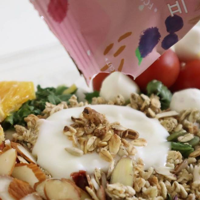 그래놀라는 간식으로도 먹기 좋지만, 다양한 음식과도 곁들일수 있어요. 그중 가장 잘 어울리는게 샐러드인데요. 샐러드에 바삭함을 추가할 수 있고 탄수화물이라 부족한 영양소를 채울 수 있어요. 요새 하루에 한 끼는 샐러드 먹기를 실천하고 있는데요. 샐러드만 그대로 먹으면 아쉬워서 이렇게 뭘 뿌려 먹거나 드레싱을 바꿔 먹으면 좋더라고요.