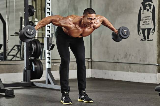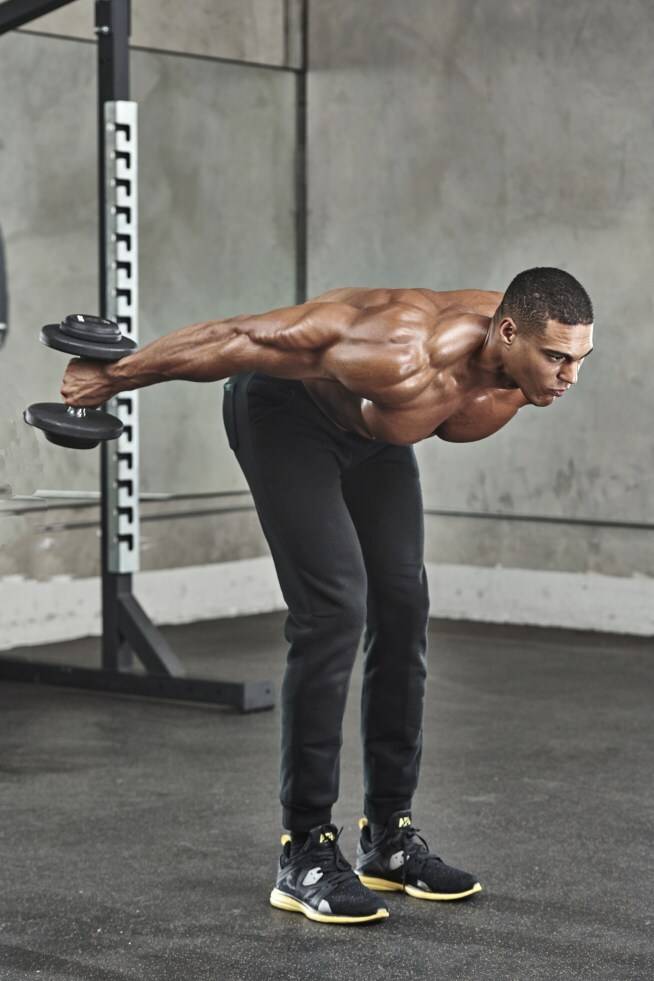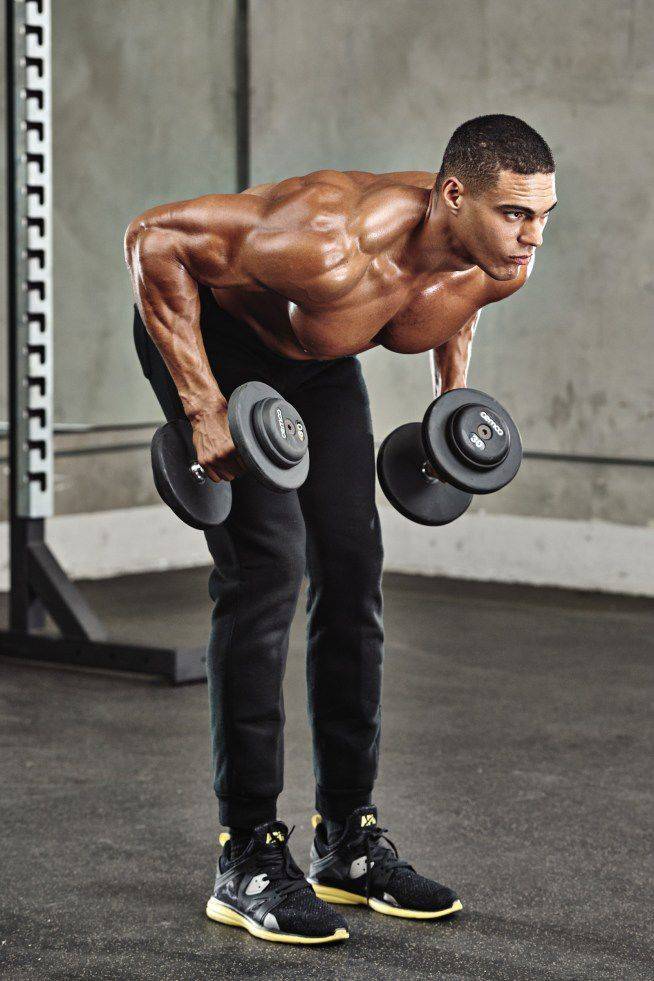 양손에 덤벨을 쥐고 상체가 바닥과 평행을 이룰 때까지 앞으로 굽히자. 팔꿈치가 위를 향하게 한 상태에서 견갑골을 쥐어짜고, 등 상단과 광배근 측면에 수축이 느껴질 때까지 덤벨을 들어 올리자. 중량을 통제하면서 아래로 내리자.