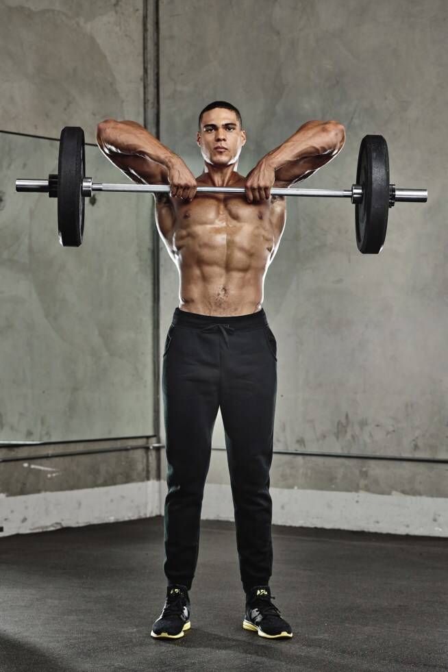 똑바로 서서 원판을 끼운 바벨을 클로즈 그립으로 잡자(사진처럼). 상체가 지나치게 흔들리지 않도록 코어에 단단히 힘을 주고, 중량을 턱 아래까지 들어 올리자. 중량을 통제하면서 천천히 아래로 낮추자.
