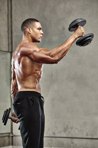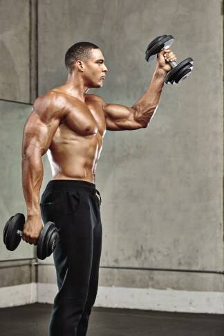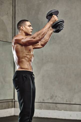 몸 바깥쪽에서 덤벨을 쥐고 눈높이와 같아질 때까지 들어 올리자. 들어 올리는 순서는 자유롭게 선택해도 된다. 어느 쪽으로 시작하든 제시된 반복 횟수를 반드시 채우도록 하자.