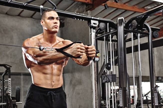 D-손잡이를 케이블 도드래에 연결하고 3쿼터로 설정하자. 손잡이를 잡고 케이블이 팽팽해질 때까지 앞으로 걸어가자. 이제 나무를 끌어안듯이 양팔을 모으자. 양쪽 손가락이 살짝 닿게 한다. 흉근의 긴장을 유지하면서 케이블을 낮추자.
